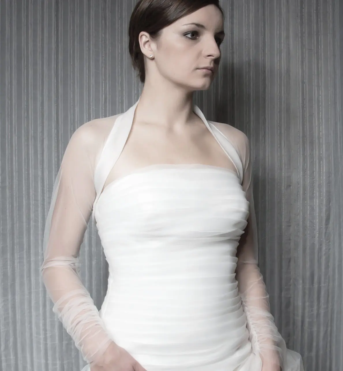 This tulle bolero with organza detailing is the perfect accessory to elevate your bridal look, combining elegance and comfort effortlessly.