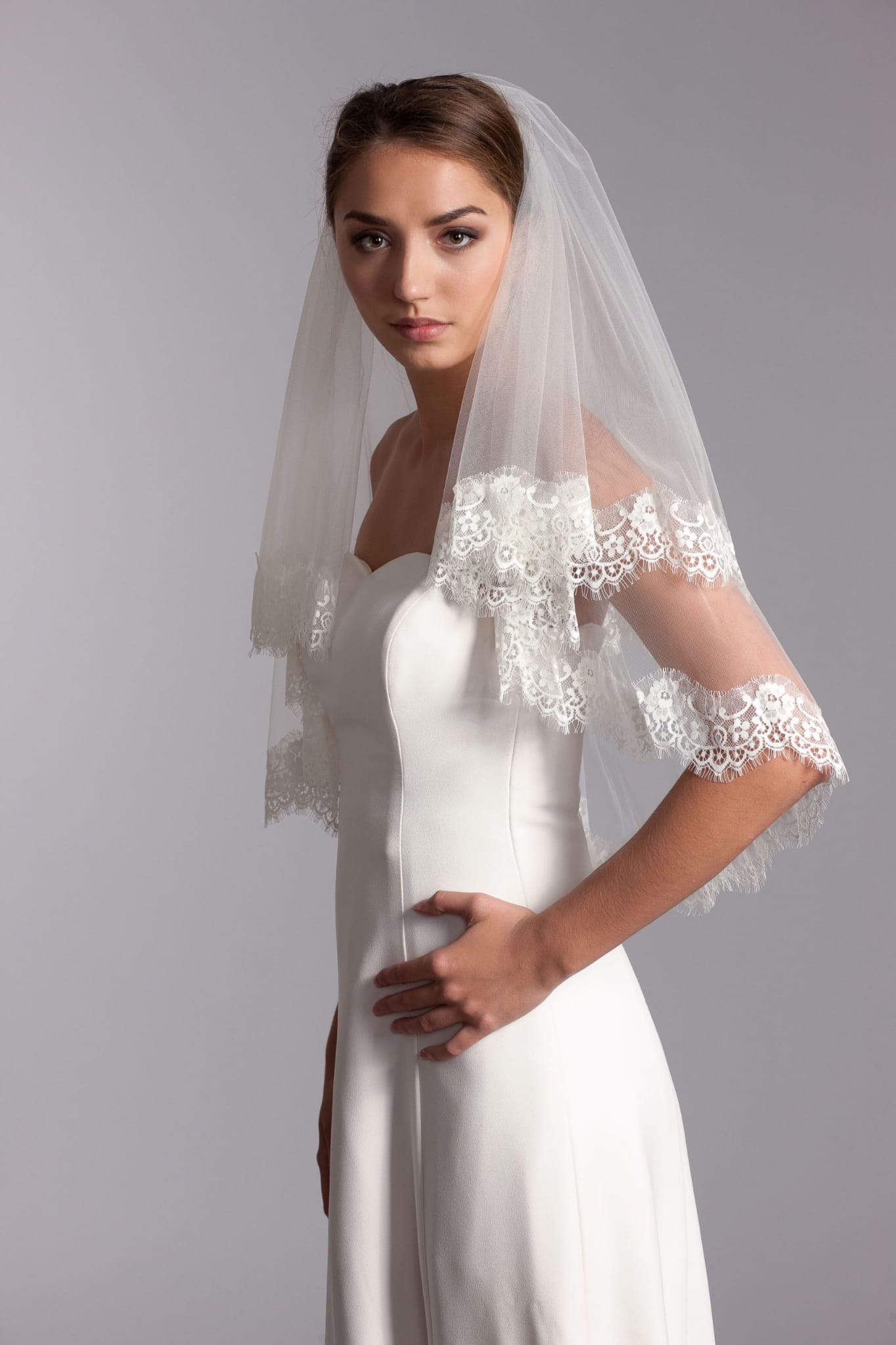 Enchanting two-tier veil enveloped in soft French lace.