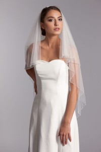 Elevate your bridal allure with our two-tiered veil, gracefully cascading to hip length and adorned with the exquisite brilliance of PRECIOSA crystals along the edges.