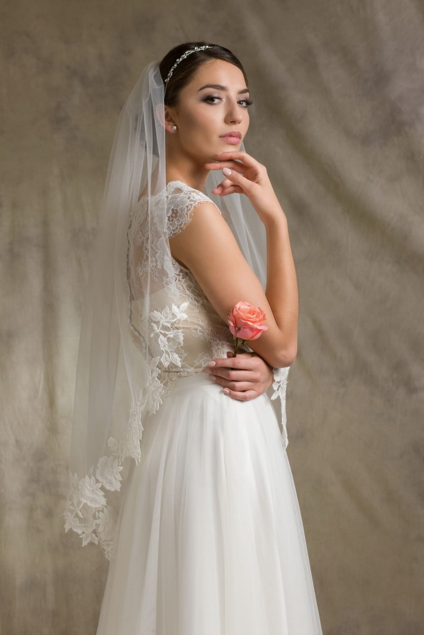 Enhance your bridal attire with our single-layer veil featuring a stunning lace pattern of large flowers and leaves that begins 50 cm down the veil.