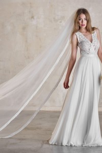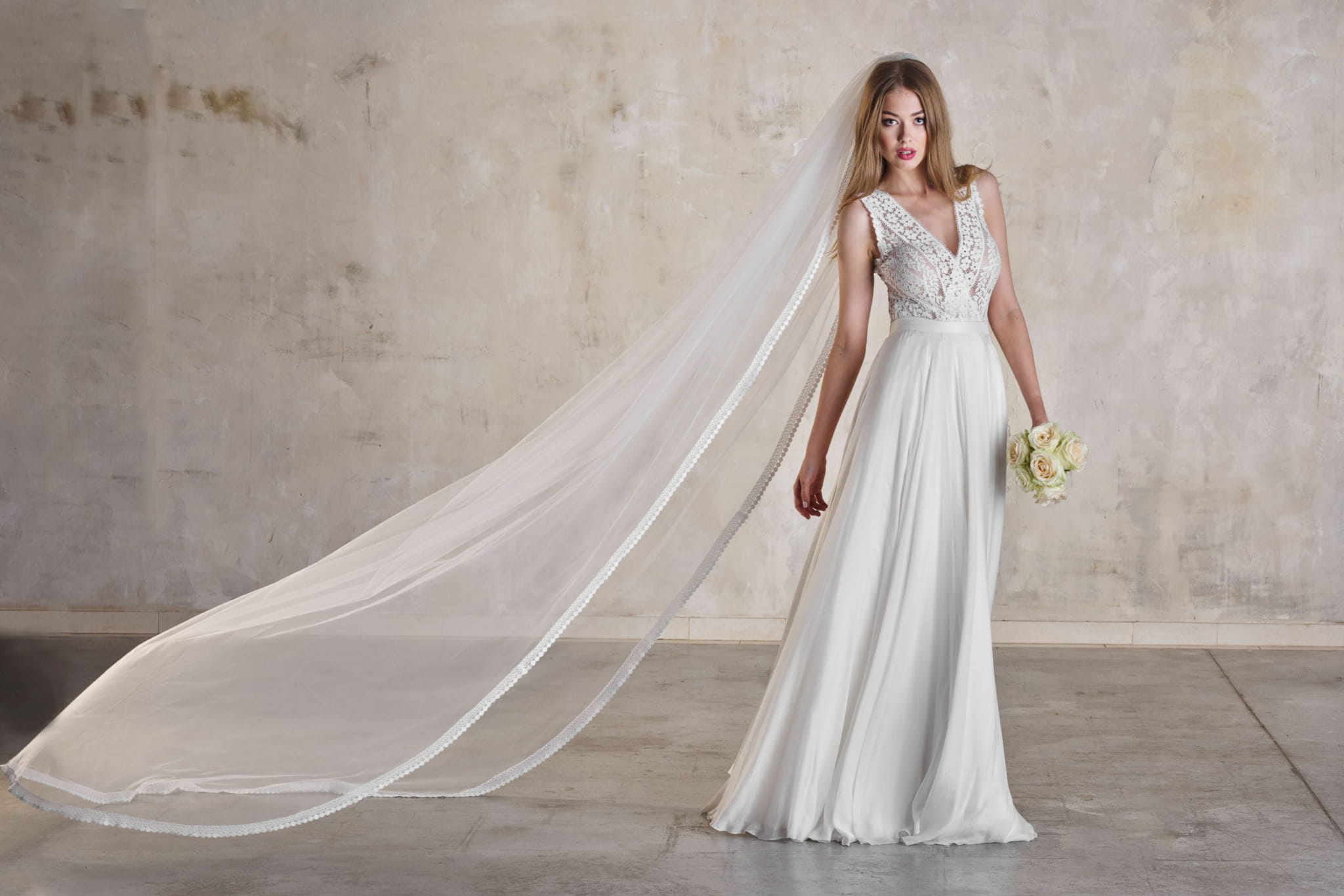 Elevate your bridal allure with our long veil, delicately trimmed with a narrow lace border featuring geometric patterns.