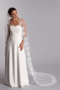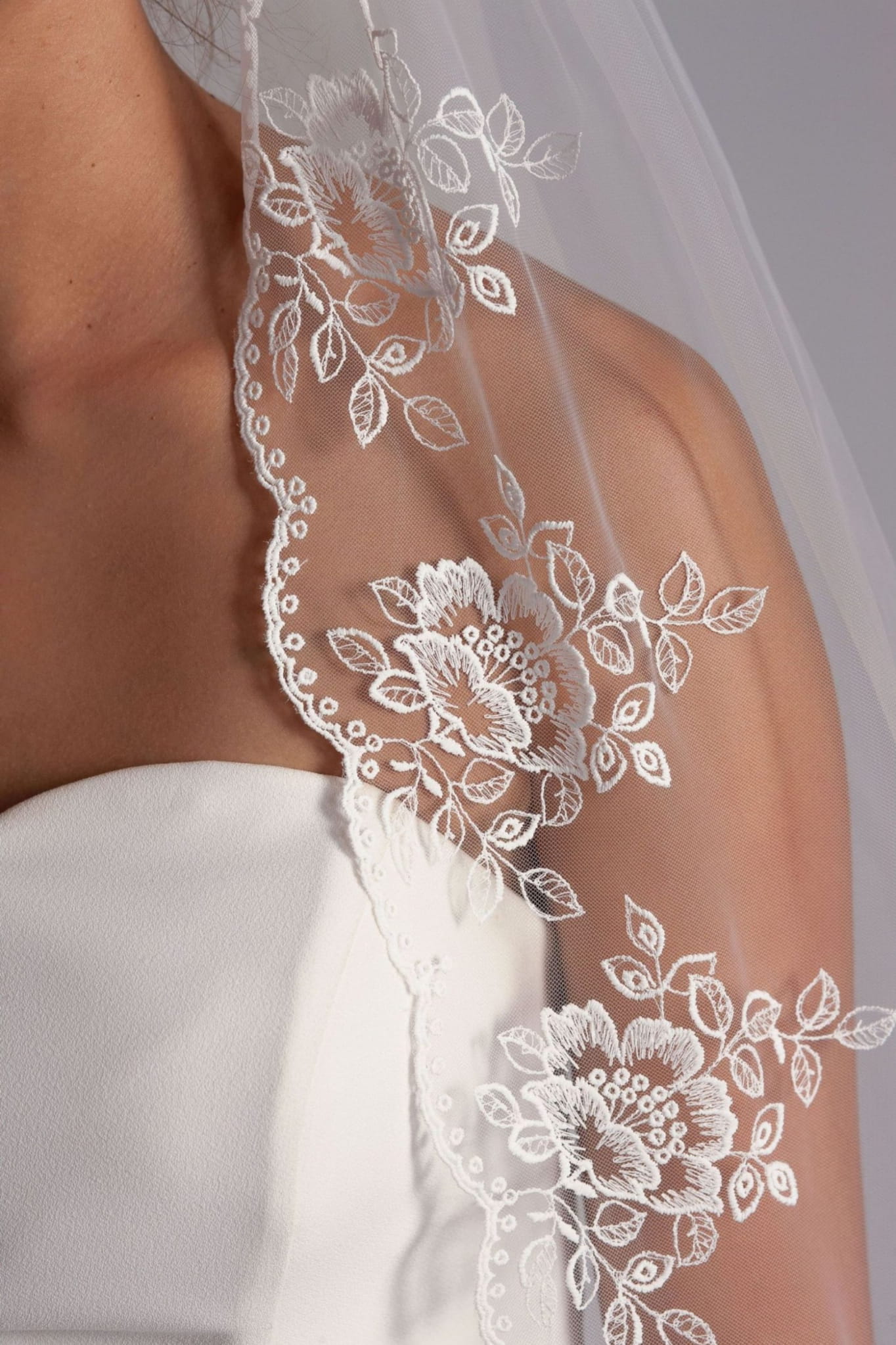 Looking for something different? Our original and unique veil features rich lace embroidery directly on the tulle, and it also includes delicate lace appliqués in addition to the lace-edged border, creating an opulent and one-of-a-kind bridal accessory.