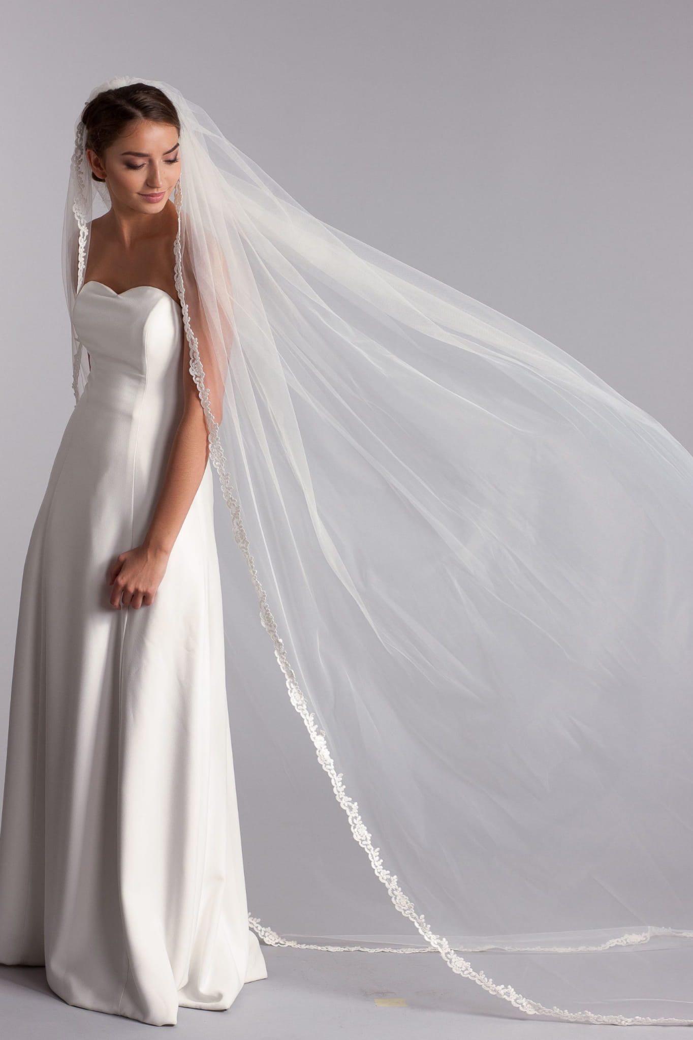 A long veil with delicate lace edging, a true classic and one of the most beloved lace veils among our brides.