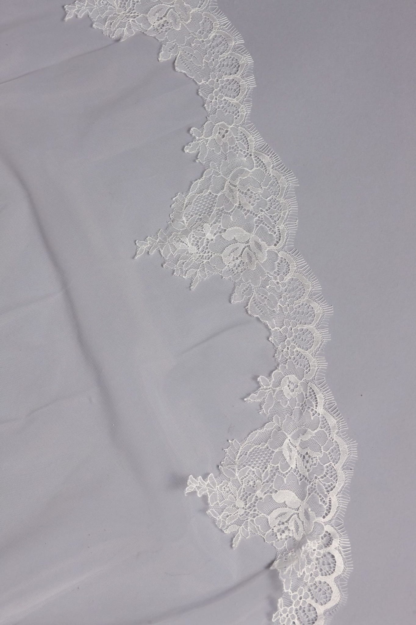 Embrace the romantic allure of our classic veil, where the intricate French lace, detailed floral motif, and delicate scalloped edge seamlessly blend to create a look of timeless grace.