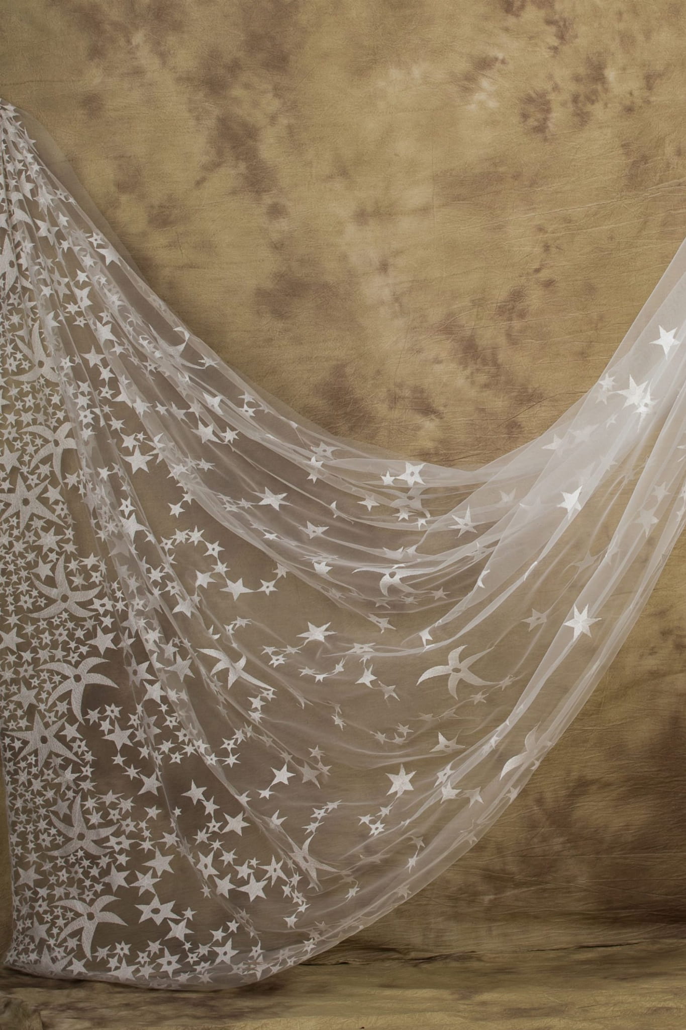 Illuminate your bridal ensemble with a long veil featuring intricately embroidered star patterns, ranging in size.