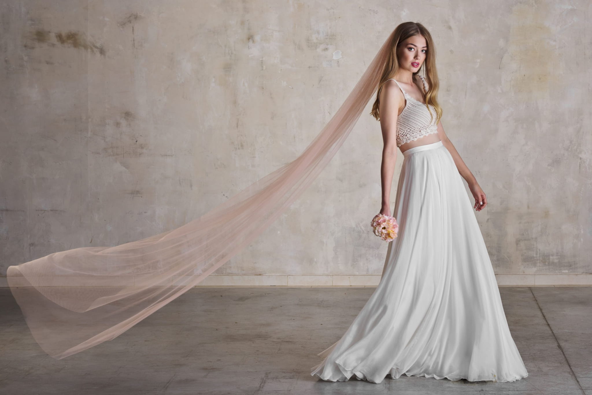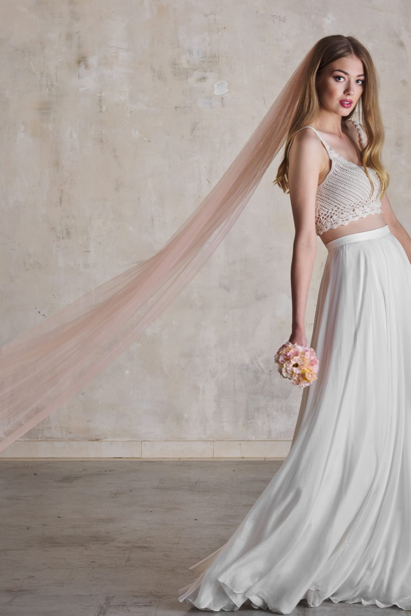 Achieve a gracefully flowing bridal look with our long, smooth veil crafted from silky blush-pink tulle.