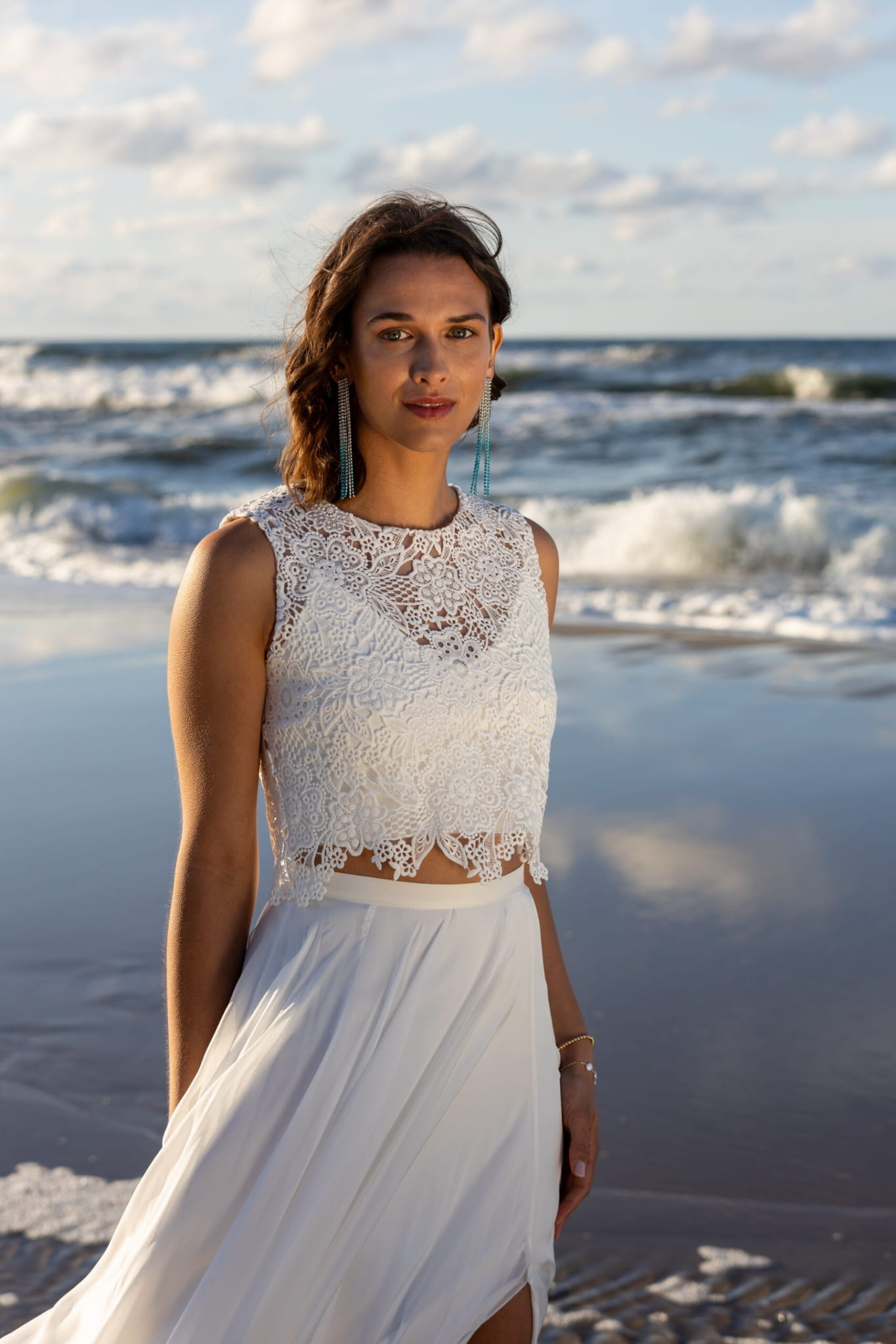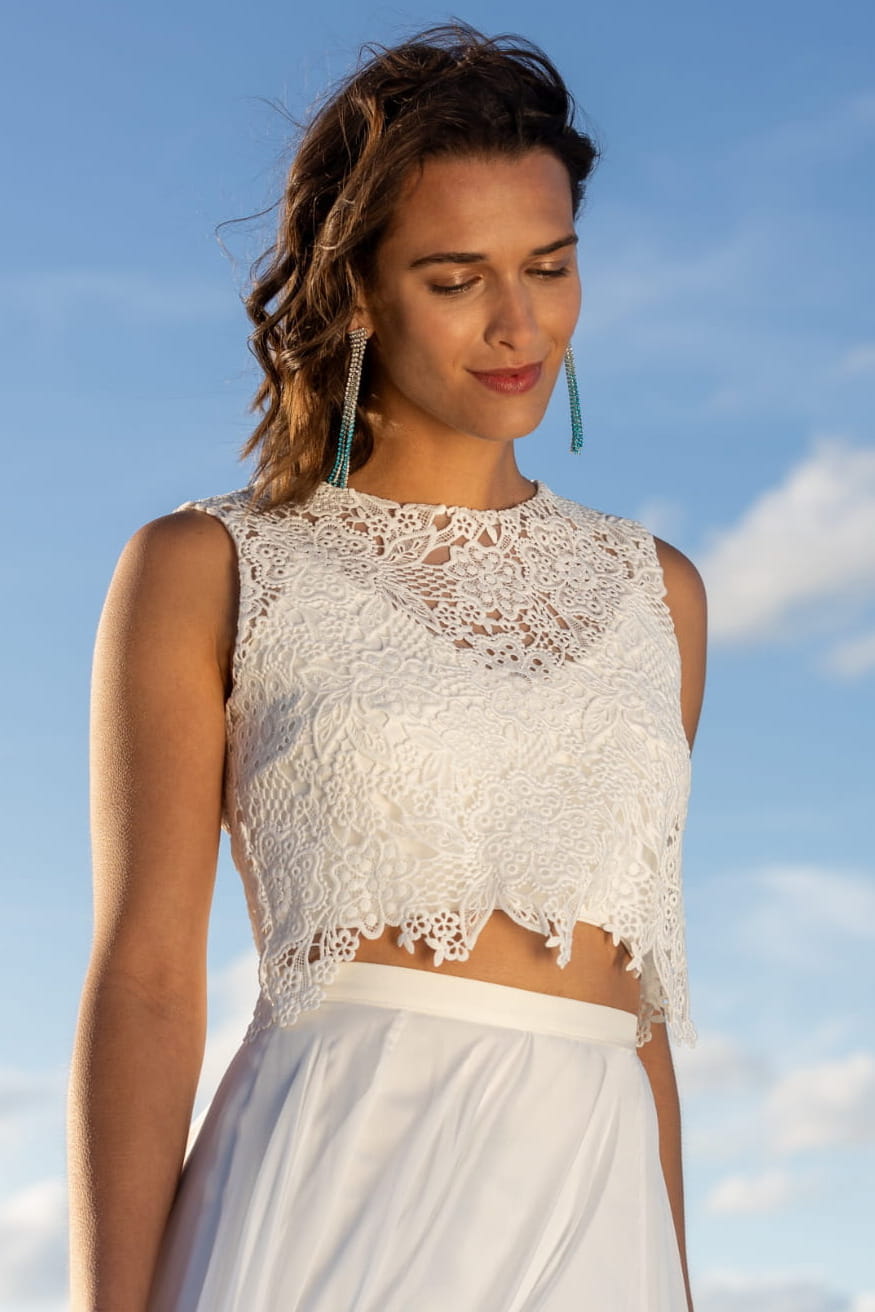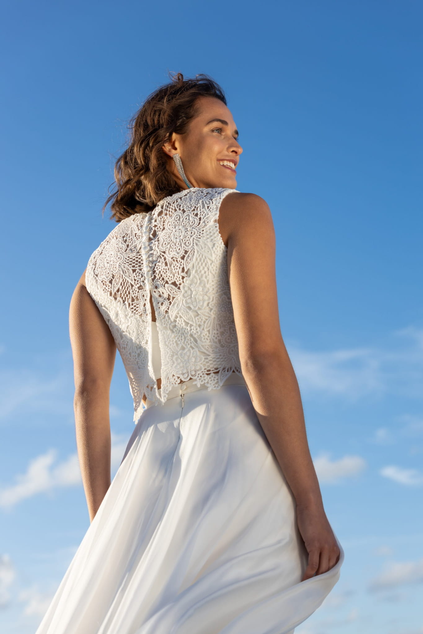 Elevate your bridal ensemble with our lace bolero ENEIDA, sleeveless and featuring a partial button closure at the back, combined with a sensual slit that reveals the back.