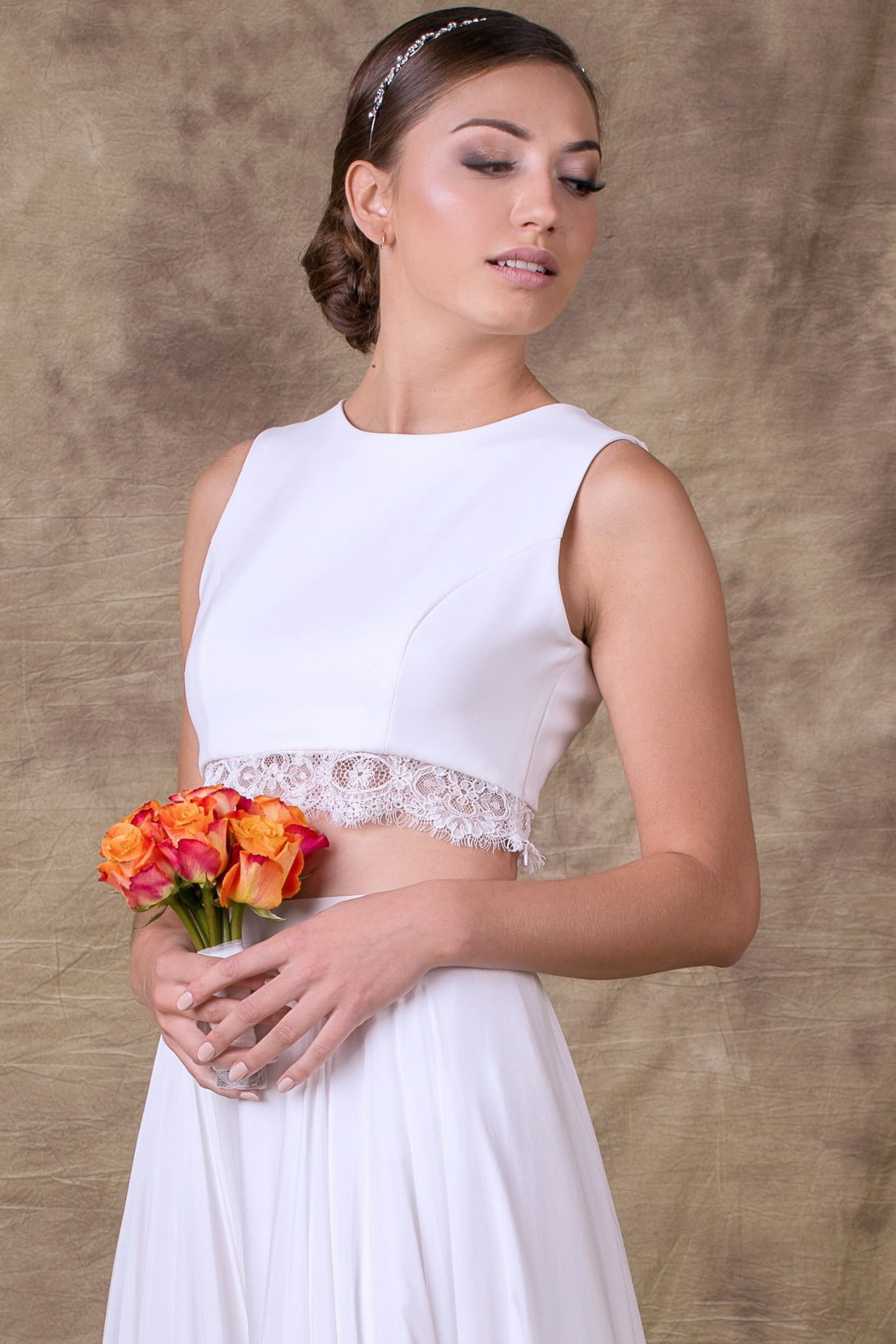 Opt for chic sophistication with a short crepe top, finished at the bottom with a lace trim.