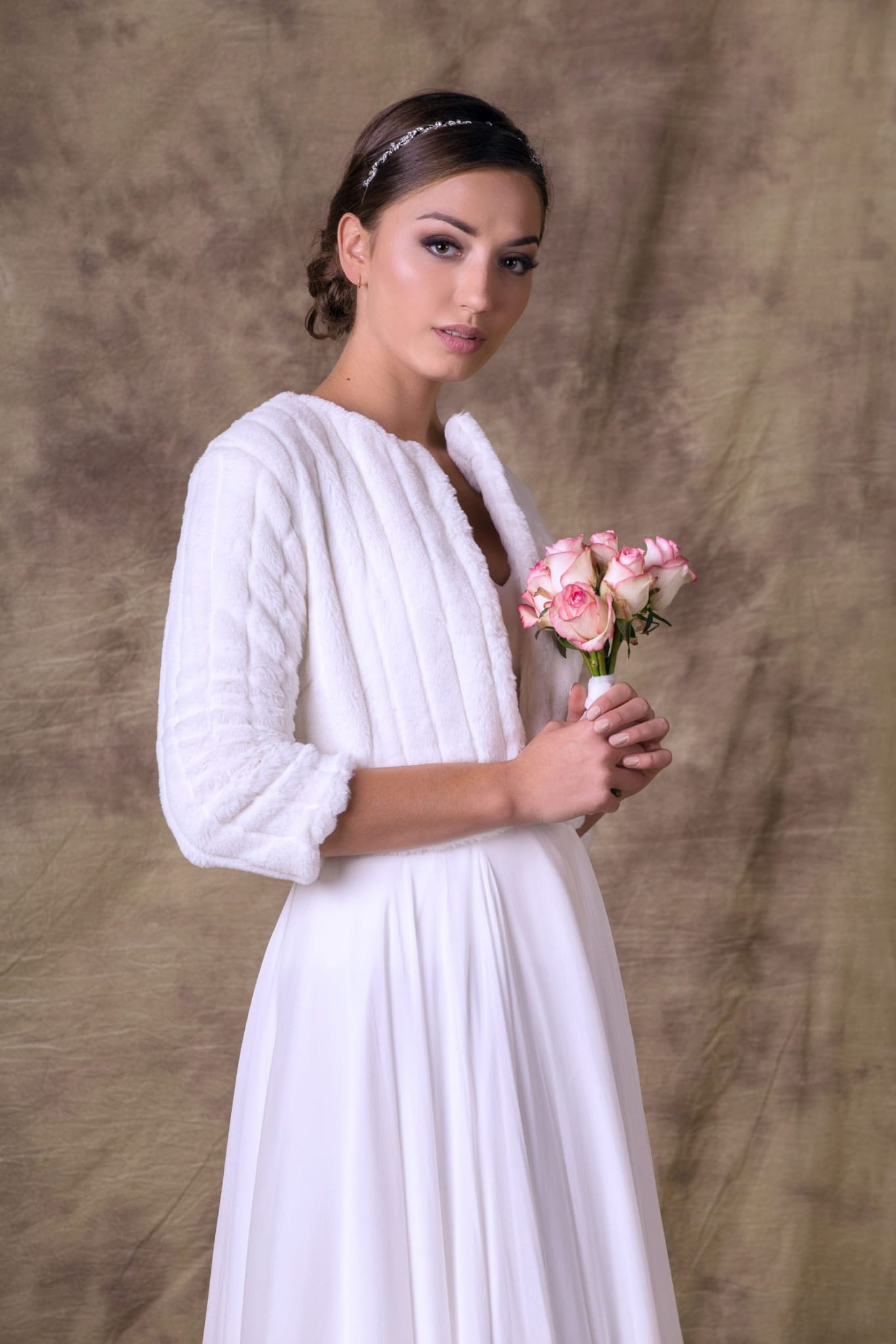 This short faux fur bridal jacket is crafted for a contemporary and stylish bridal look.