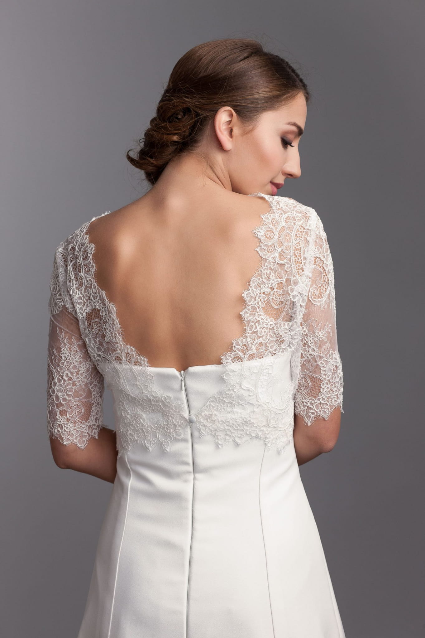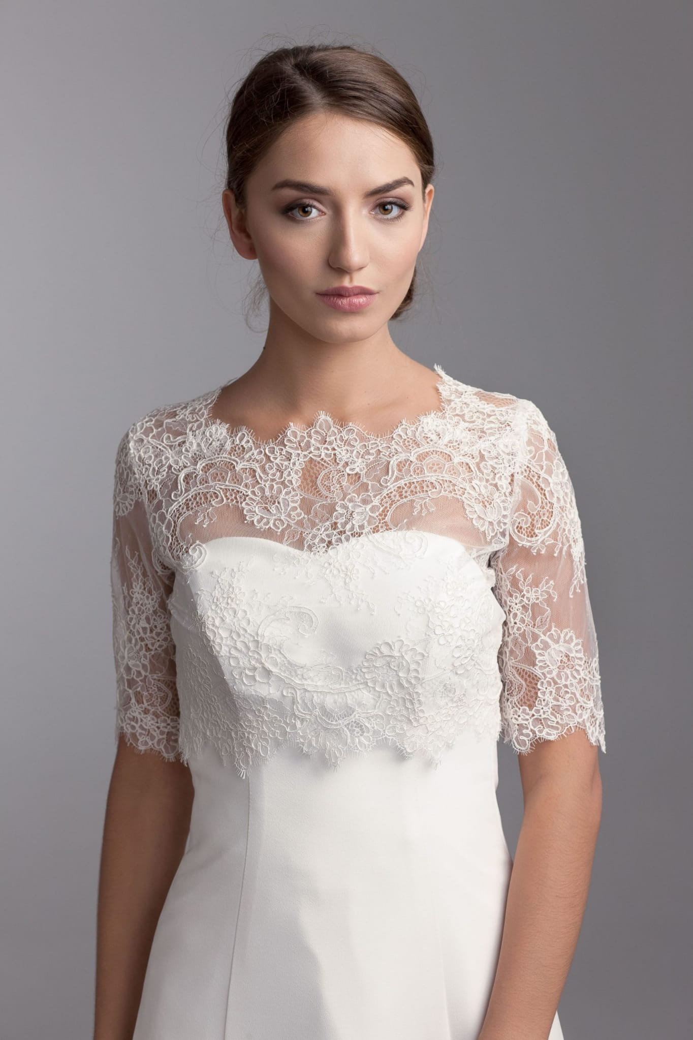 A classic lace bolero featuring elbow-length sleeves and a modest neckline at the front.