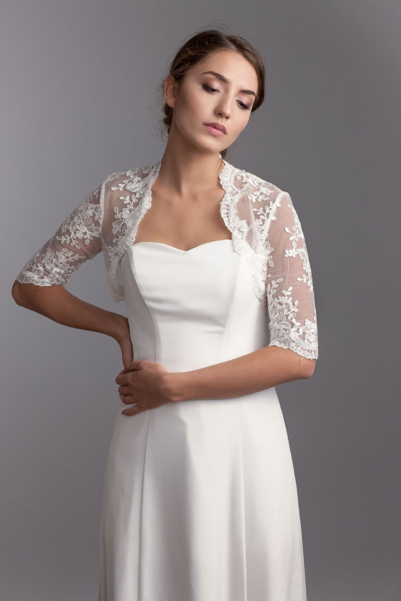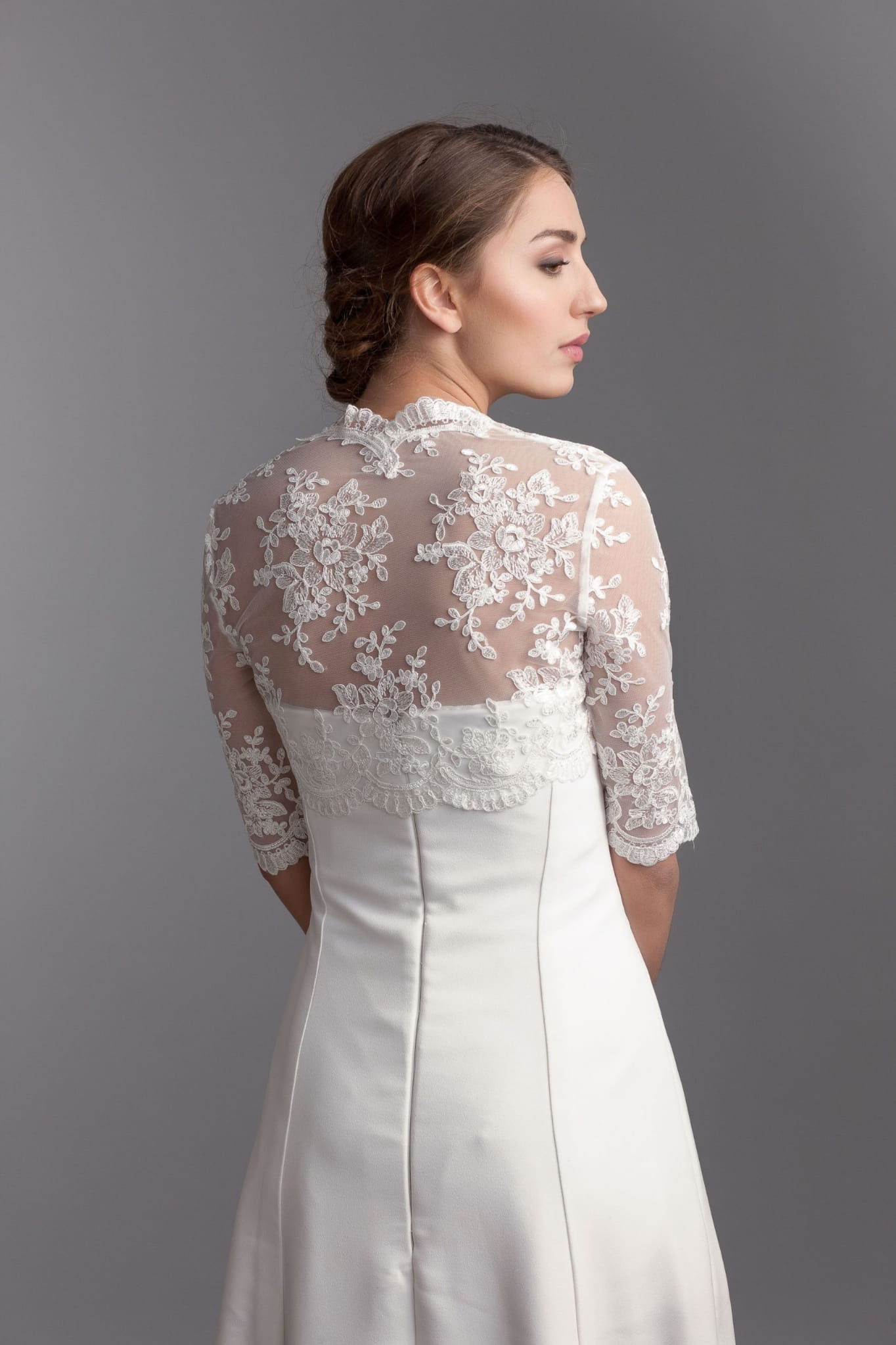 Elevate your outfit with our timeless bolero, meticulously crafted from exquisite Chantilly lace. This classic piece showcases elbow-length sleeves, a closed back, and a captivating open neckline at the front.