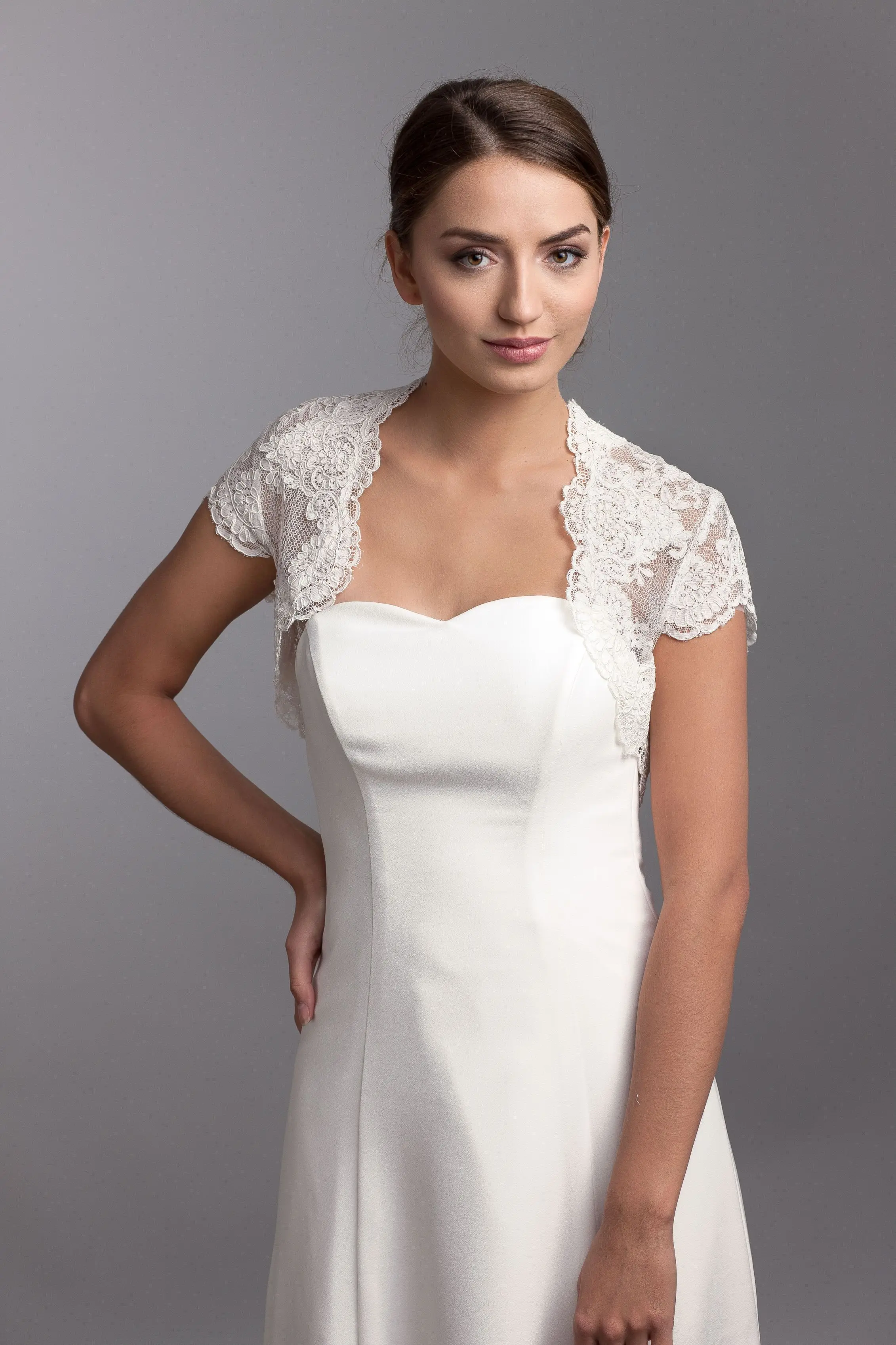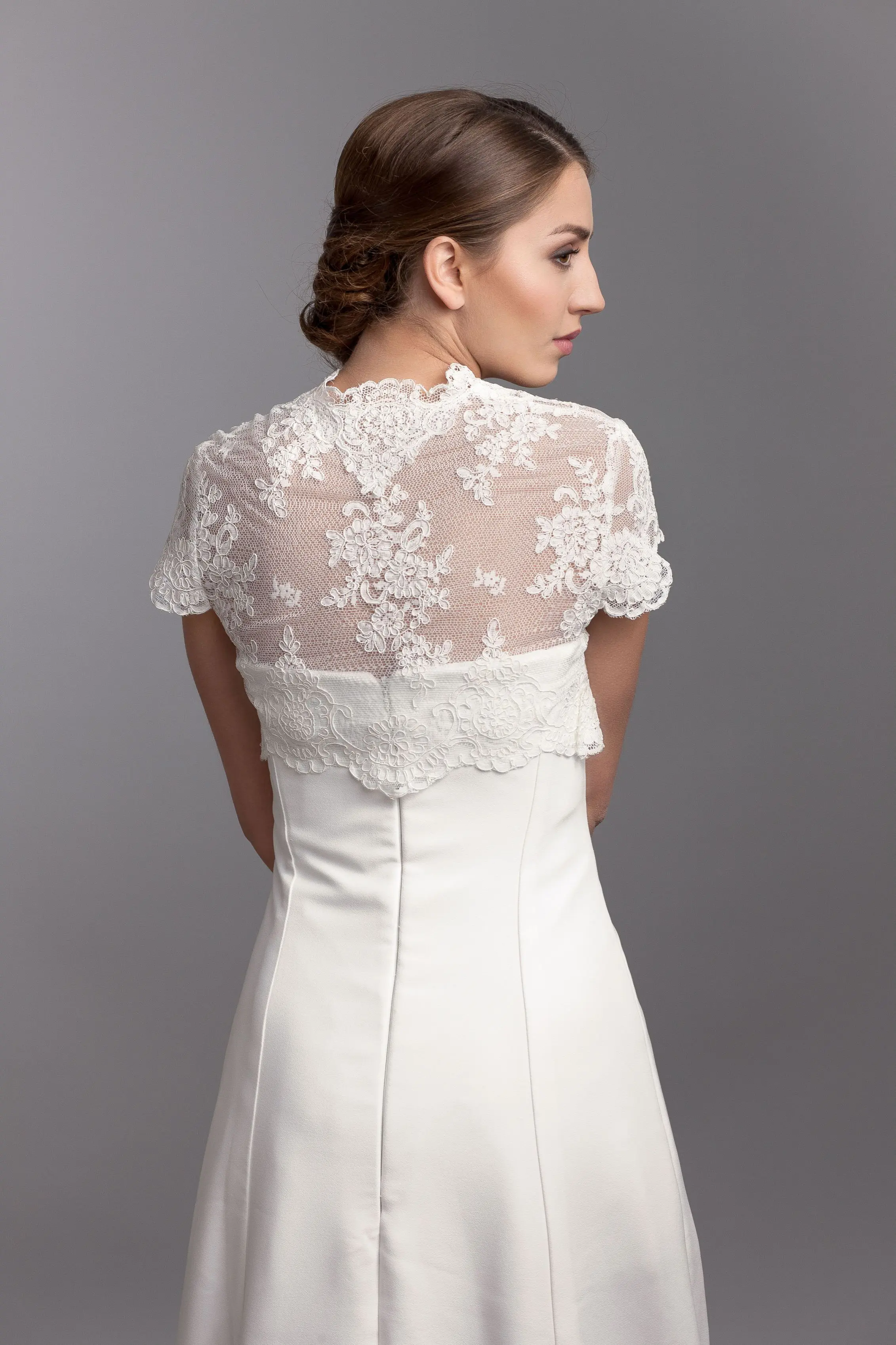A timeless bolero intricately fashioned from Chantilly lace, forming a graceful butterfly shape.