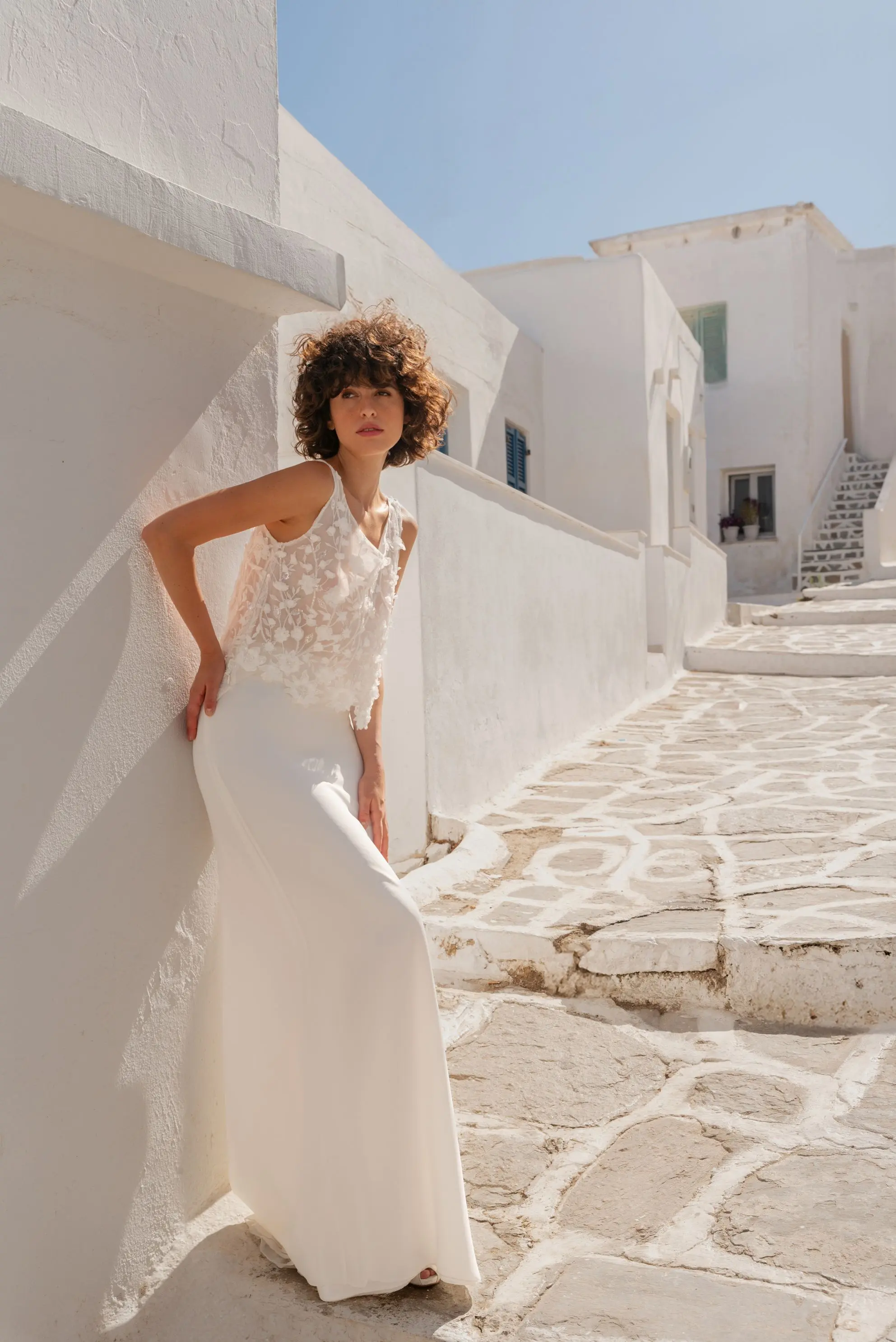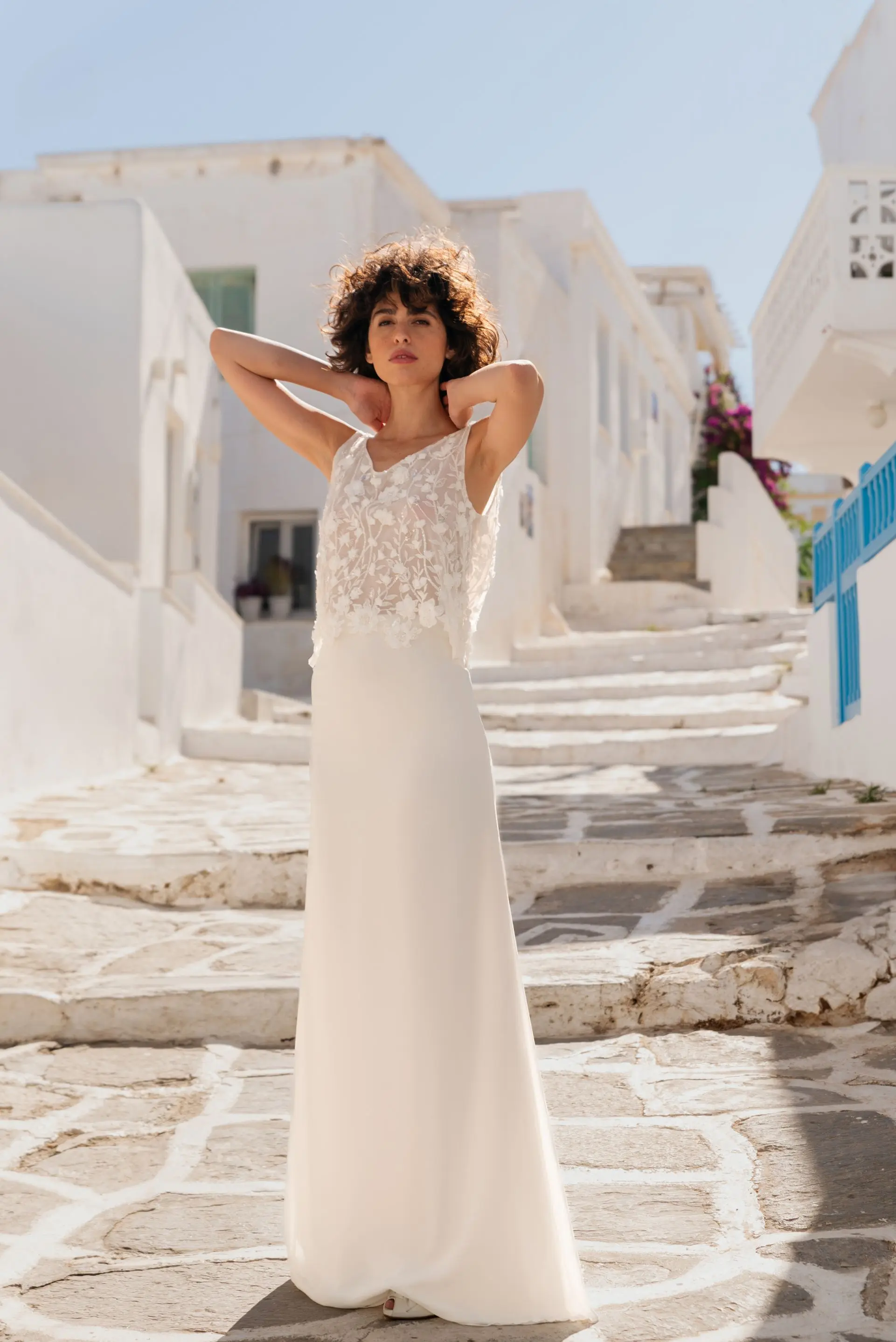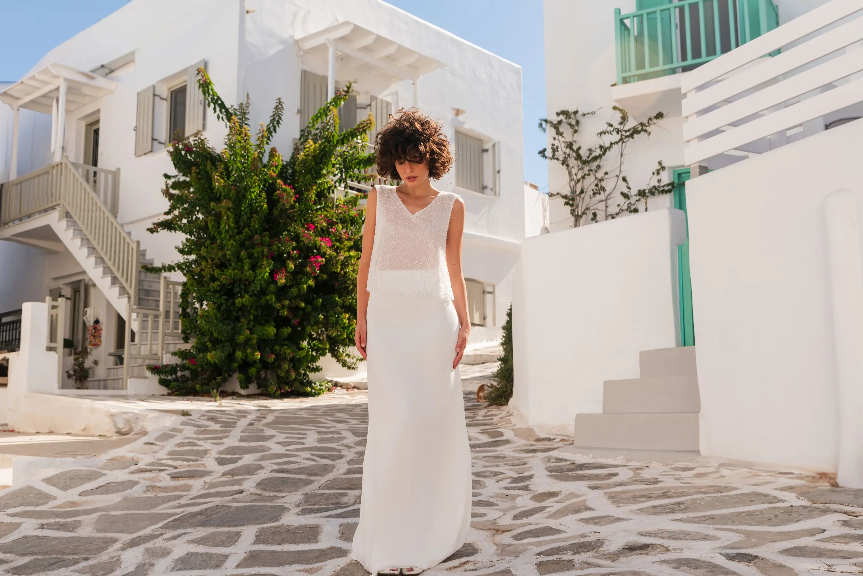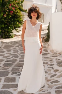 Simple and elegant, it features a clean design without a train, perfect for a timeless bridal look or any formal occasion.