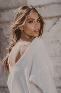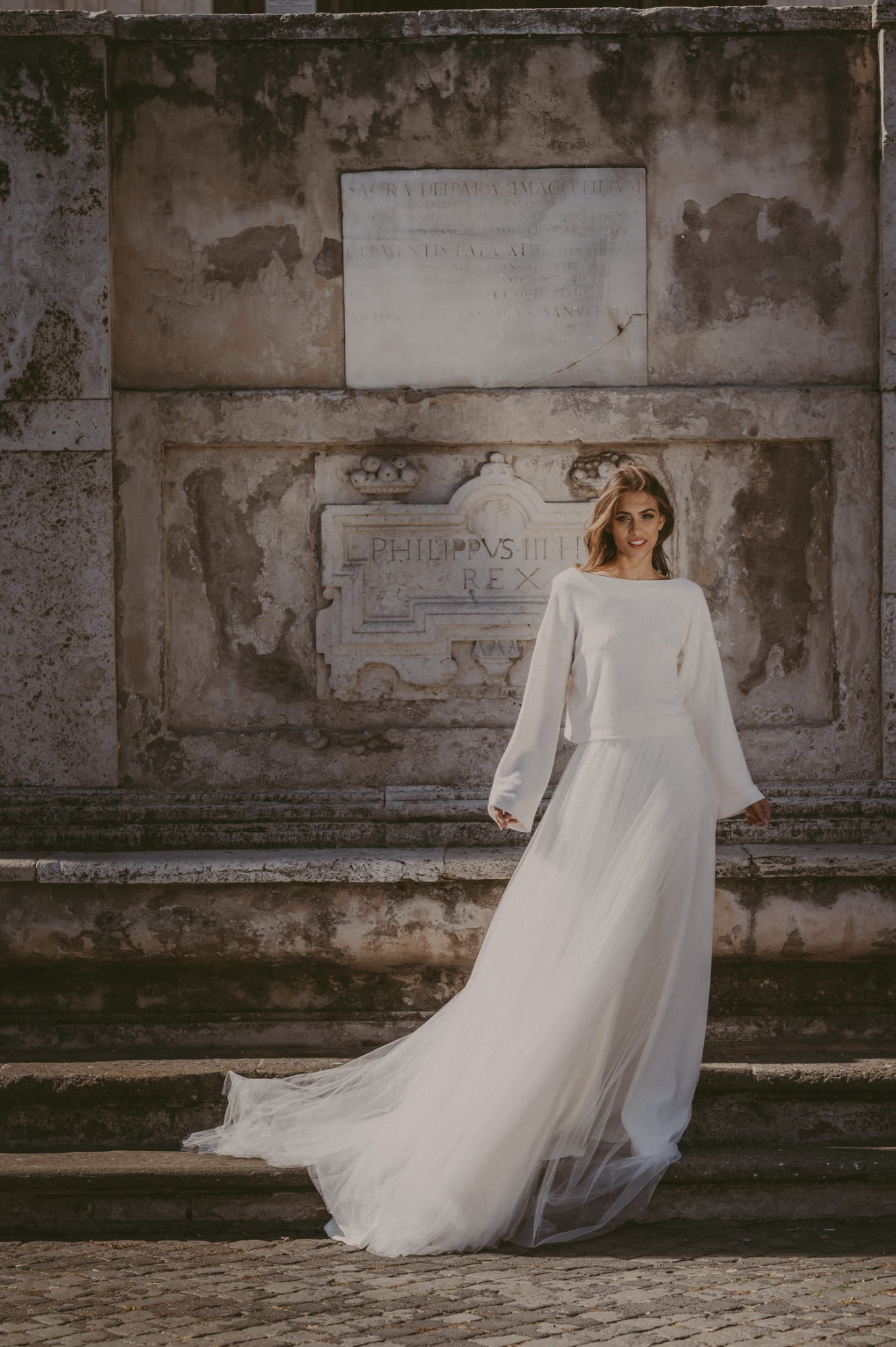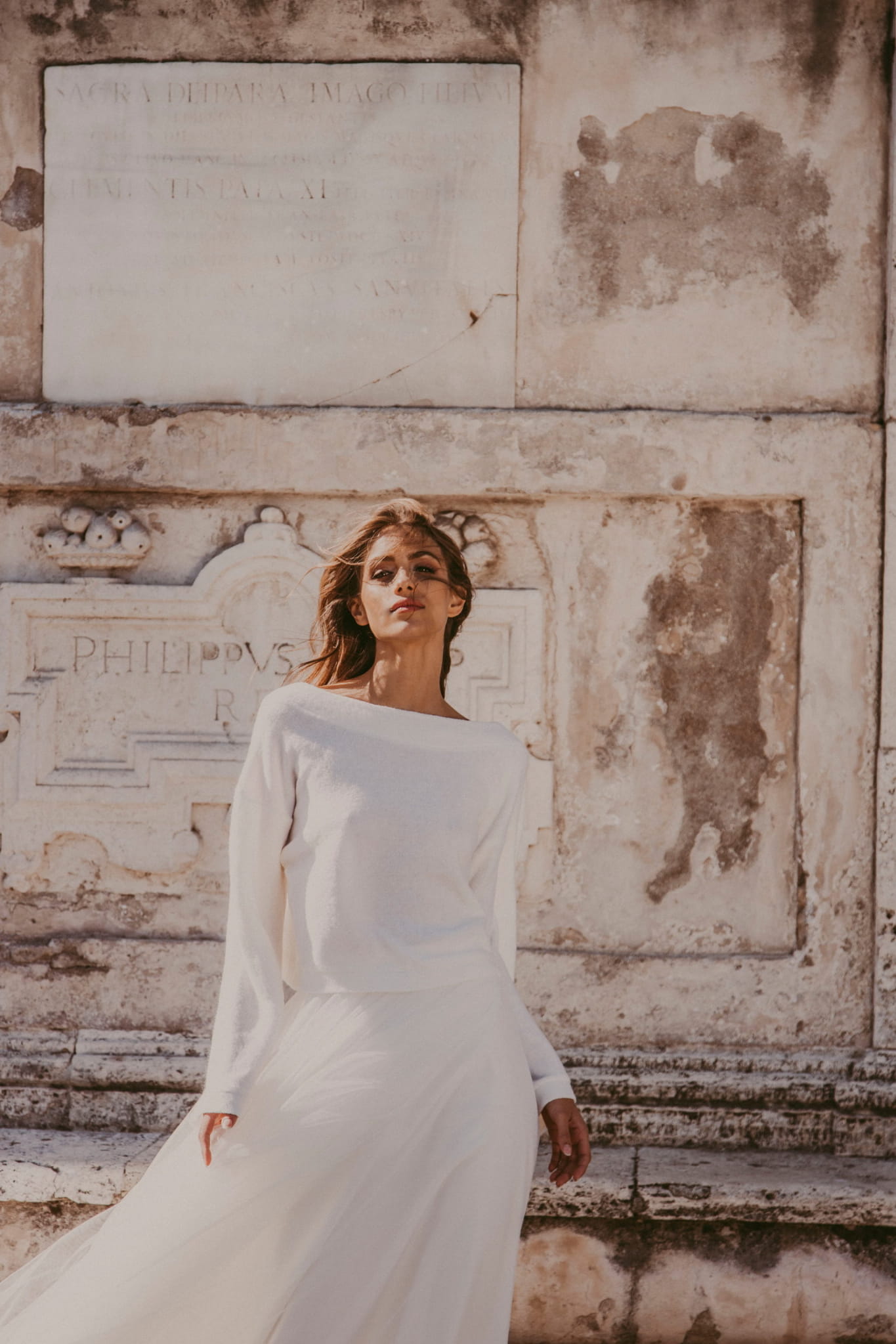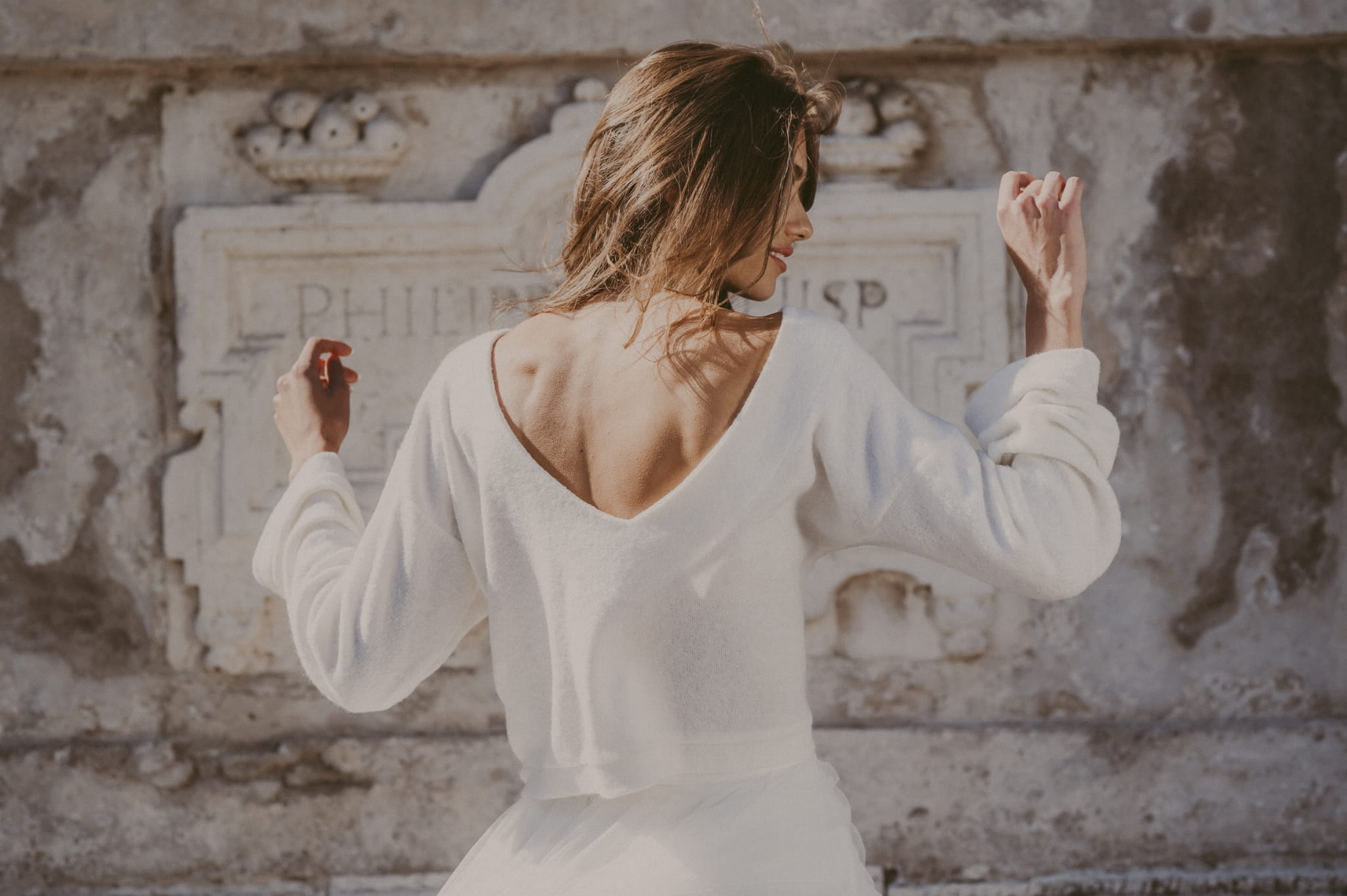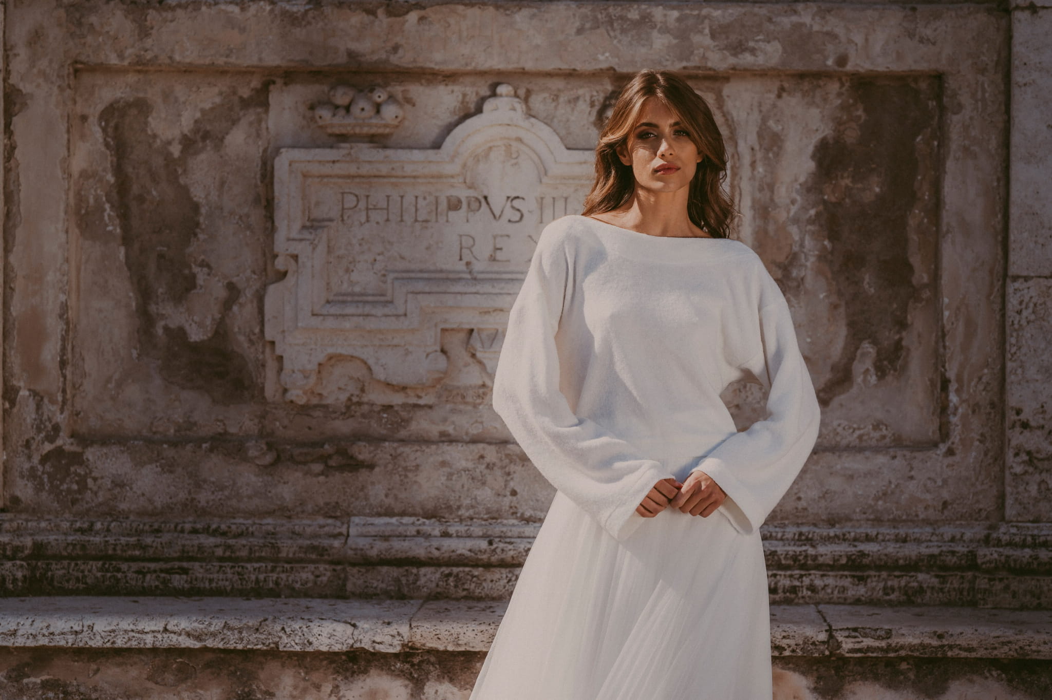 Elegant wedding sweater REESE with long sleeves made of an angora-like knit fabric.