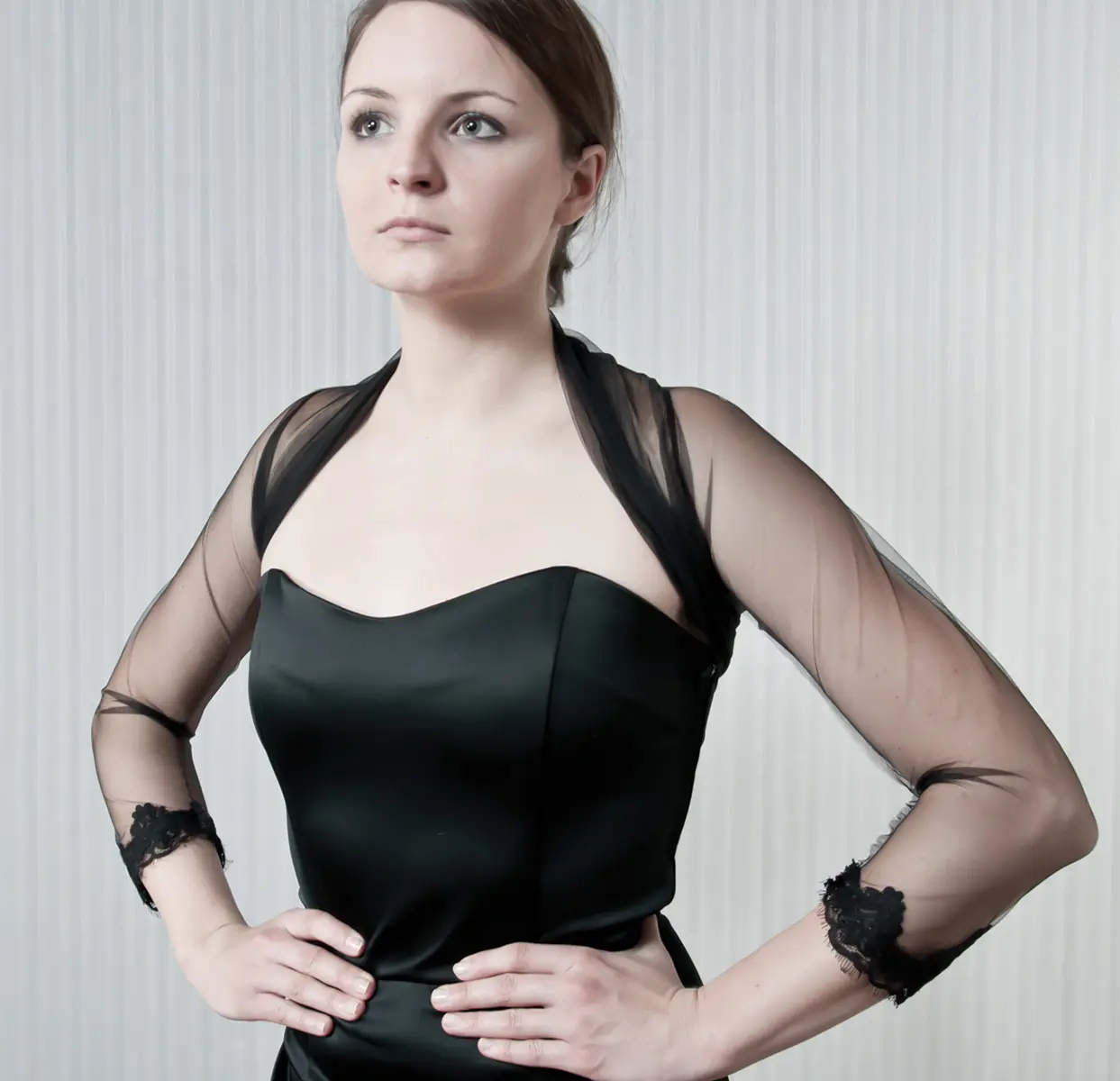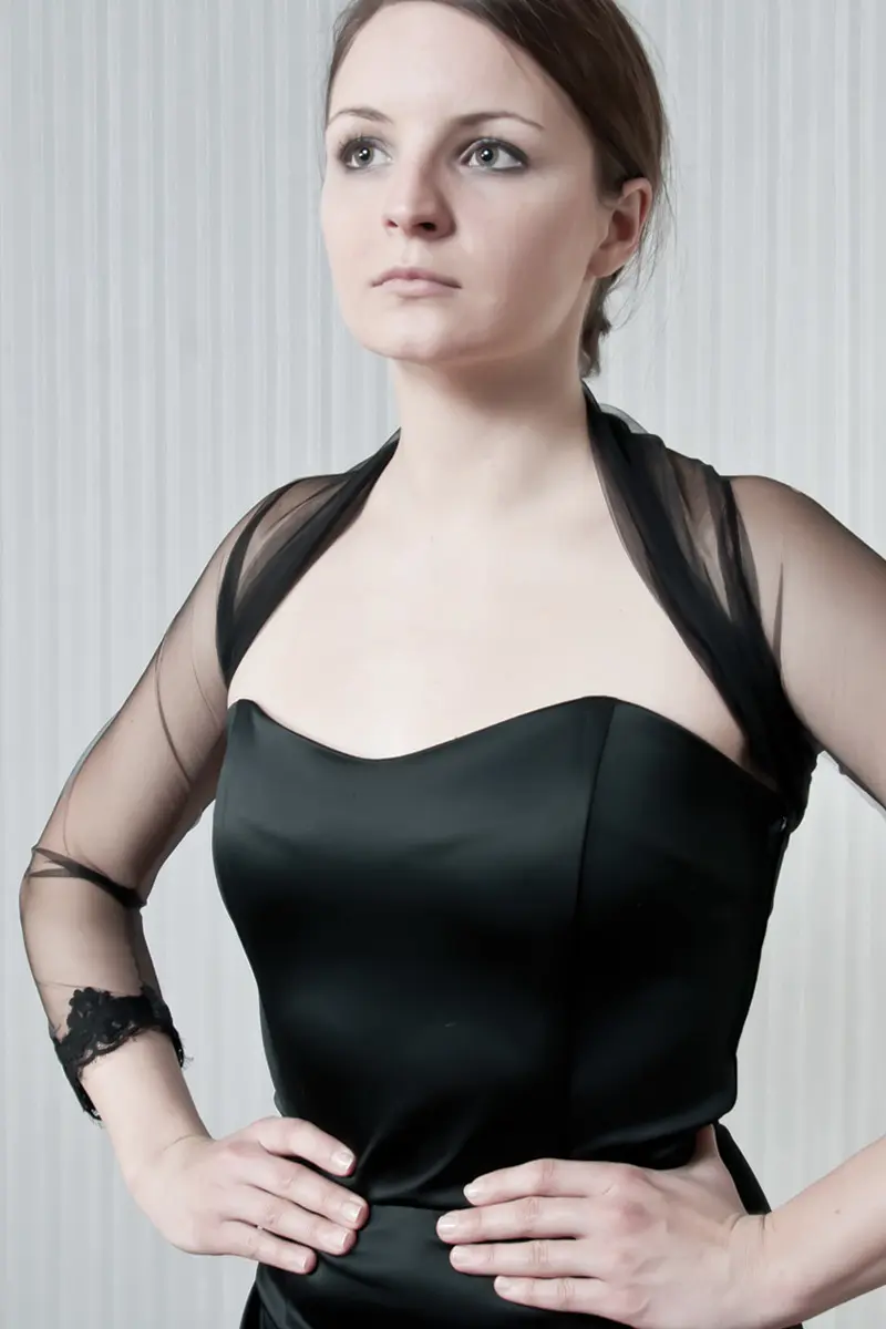 This elegant bolero is crafted from soft, sheer black tulle and features a delicately gathered neckline that adds a touch of texture and sophistication. The cuffs are finished with intricate lace trim, giving the piece a refined and feminine look.